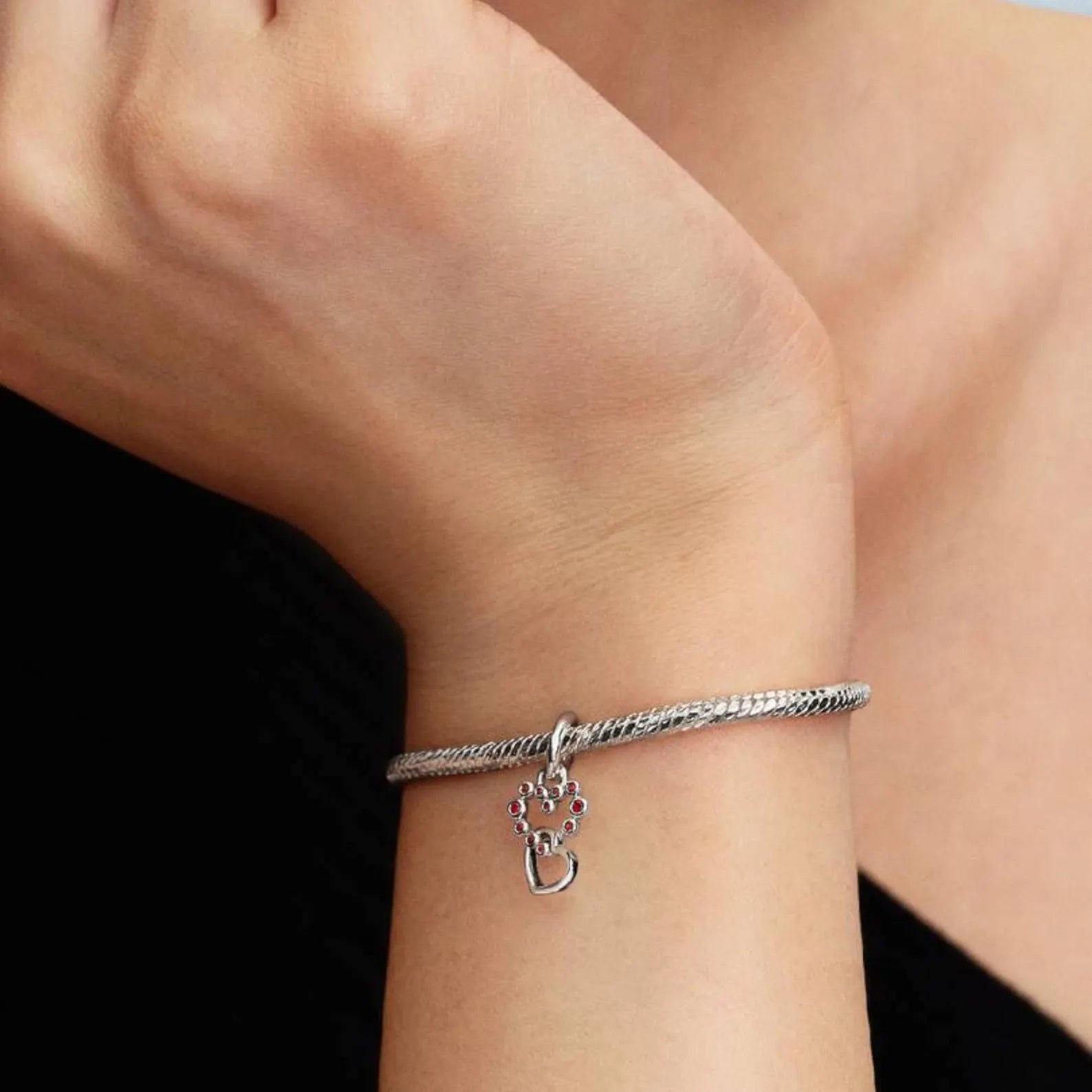 A symbol of love and connection, the Connected Hearts & Red Stones Dangle Charm is crafted in S925 sterling silver, featuring vibrant red crystals set in a heart with a second heart that moves freely to catch the light.